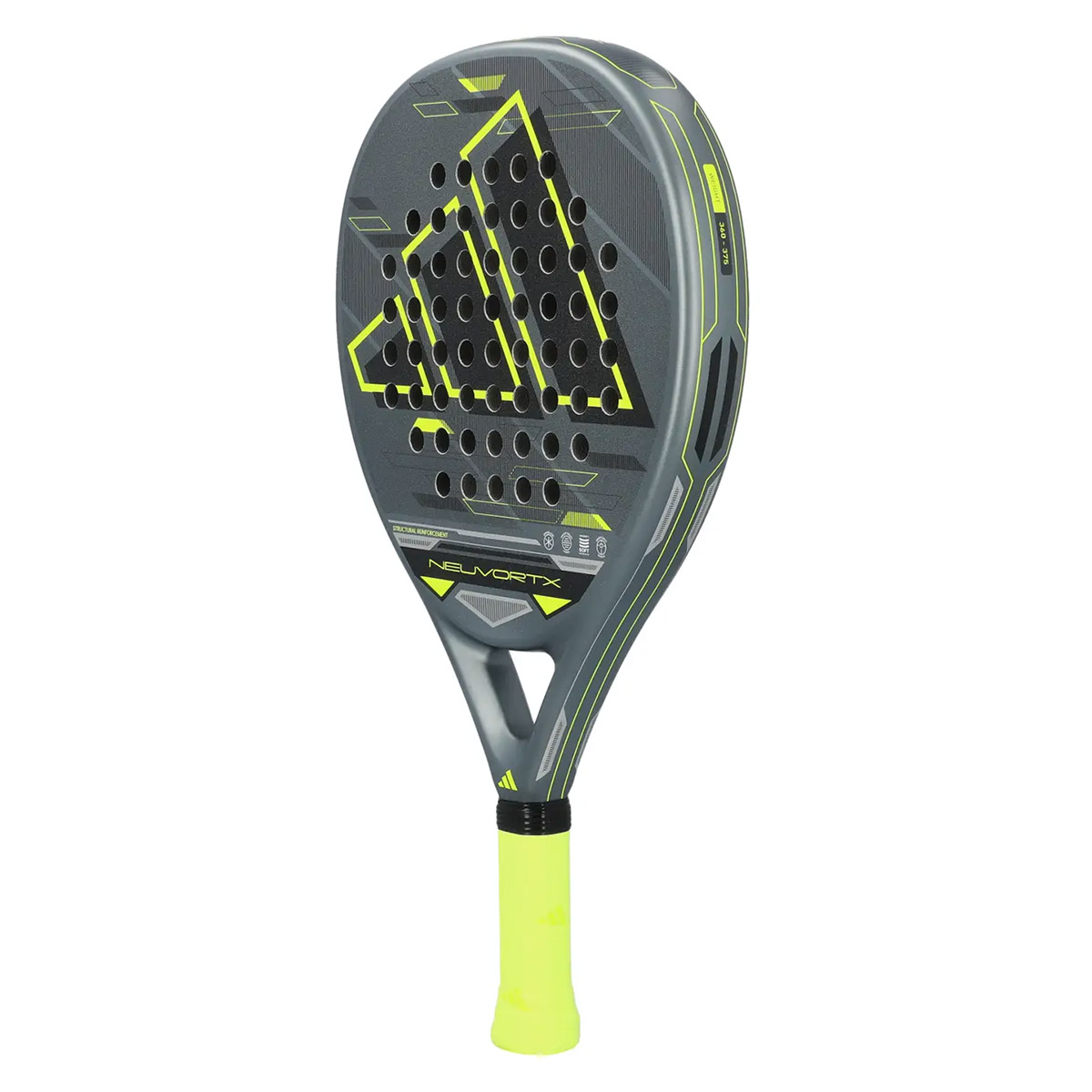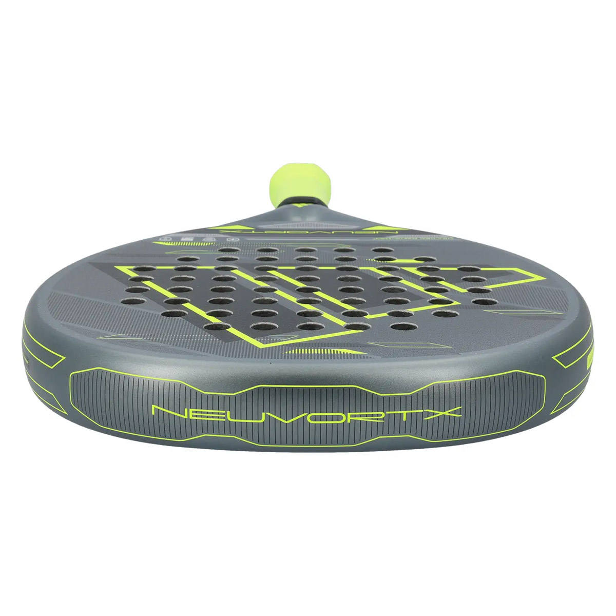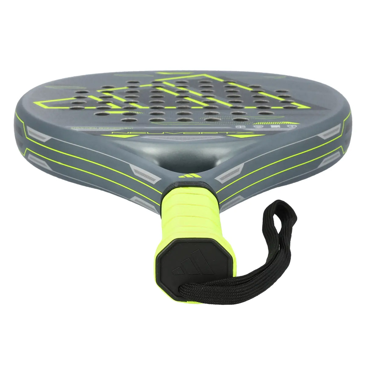 Nowa rakieta Adidas Neuvortx w szaro-zielonym kolorze została zaprojektowana dla tych, którzy szukają wyjątkowej równowagi między kontrolą a mocą. Jej hybrydowy kształt zapewnia wyśrodkowany i szeroki sweet spot, ułatwiając bardziej precyzyjne i stabilne uderzenia.