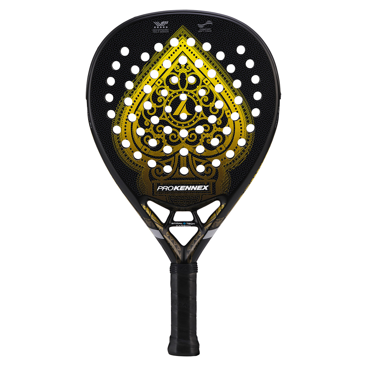 ProKennex Black Ace to najlepszy wybór dla atakujących graczy, którzy wymagają mocy, precyzji i kontroli na korcie. Ta rakieta w kształcie diamentu została zaprojektowane tak, aby zapewniać wybuchowe uderzenia, dzięki trzem warstwom Spiral Tech Carbon® i miękkiemu rdzeniowi EVA® o sztywności 16 °, zapewniając idealną równowagę między mocą i szybkością reakcji. Technologia ULTRASPIN, obejmująca 3D Grain Surface® i GeoDinamic Hole Design®, zapewnia zabójczy spin i lepszą kontrolę nad piłką, pozwalając zdominować każdy rajd.