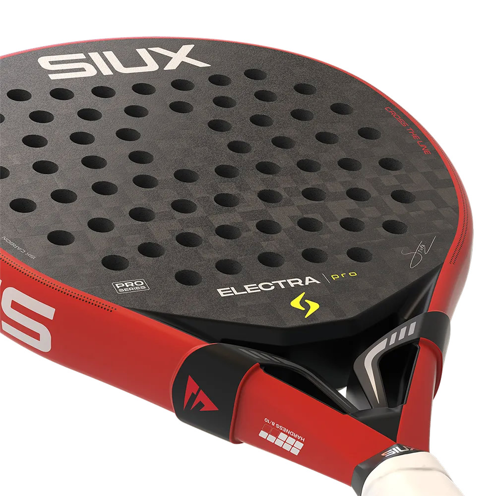 Siux Electra Pro Fire Red 2026 to rakieta, która robi wrażenie już od pierwszego uderzenia. Jej elegancki czarny design z ognistoczerwonymi wykończeniami odzwierciedla intensywność gry Franco Stupaczuka. Nowoczesny i agresywny wygląd uzupełnia matowe, piaskowane wykończenie, zapewniające doskonałą przyczepność i estetykę premium, która wyróżnia się zarówno na korcie, jak i poza nim.