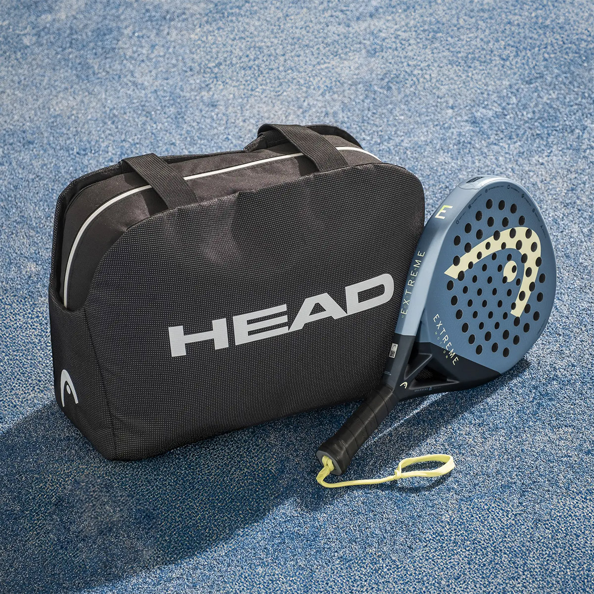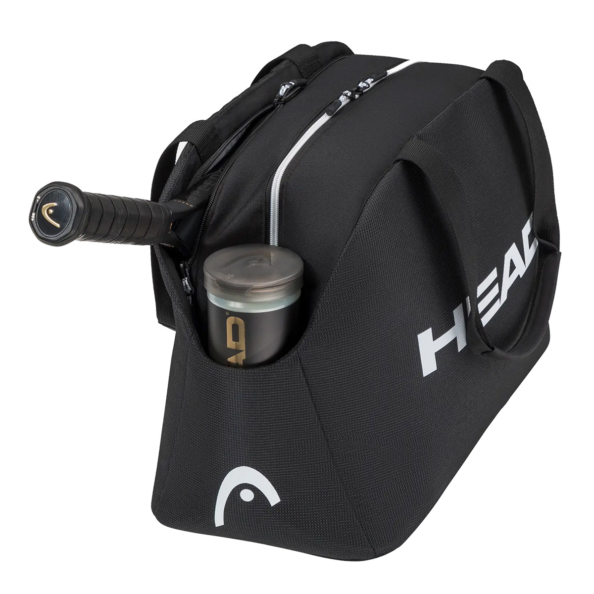 Kieszenie na akcesoria zapinane na zamek — jedna zewnętrzna i jedna wewnętrzna — oraz dwie wewnętrzne kieszenie z siateczki podnoszą komfort. Z obu boków torby znajdują się uchwyty na bidony lub butelki z wodą — praktyczne rozwiązanie ułatwiające nawadnianie. Torba jest sprzedawana w opakowaniu z plastiku z recyklingu, a jej metkę wykonano z przetworzonego papieru i przywiązano ekologicznym sznurkiem konopnym — to przykład na to, jak HEAD stara się ograniczyć zużycie plastiku.