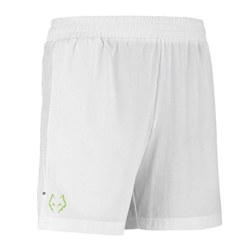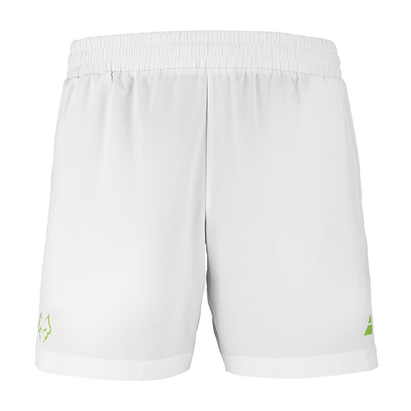 Białe spodenki z technicznej tkaniny z kolekcji Juana "Wilka" Lebrona - wielokrotnego #1 światowej listy padla. Duże kieszenie pomieszczą piłki. Zielone detale - logo Babolat i wilk - symbol gracza.